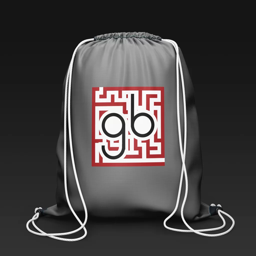 - Letters: Lowercase g and b in black, built as simple geometric forms. Strokes are consistent and match the visual weight of the maze walls, which keeps the mark unified and legible.