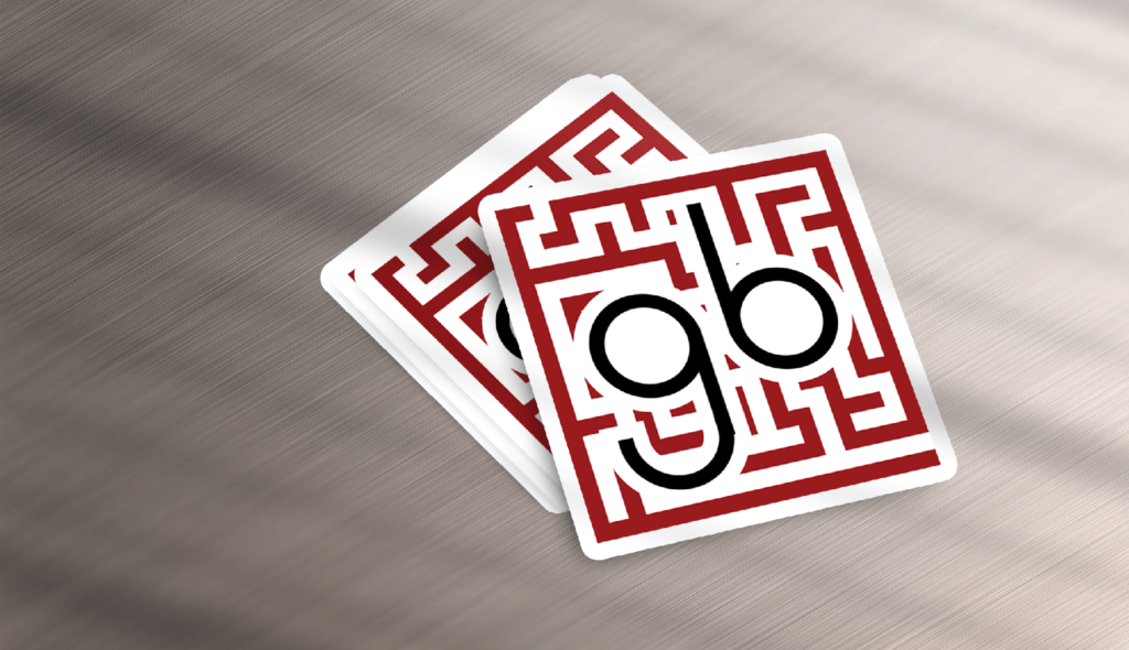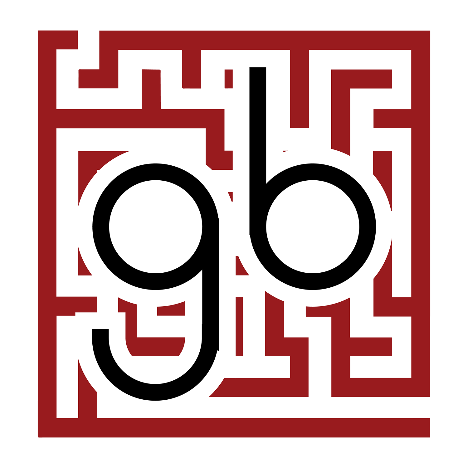 - Letters: Lowercase g and b in black, built as simple geometric forms. Strokes are consistent and match the visual weight of the maze walls, which keeps the mark unified and legible.