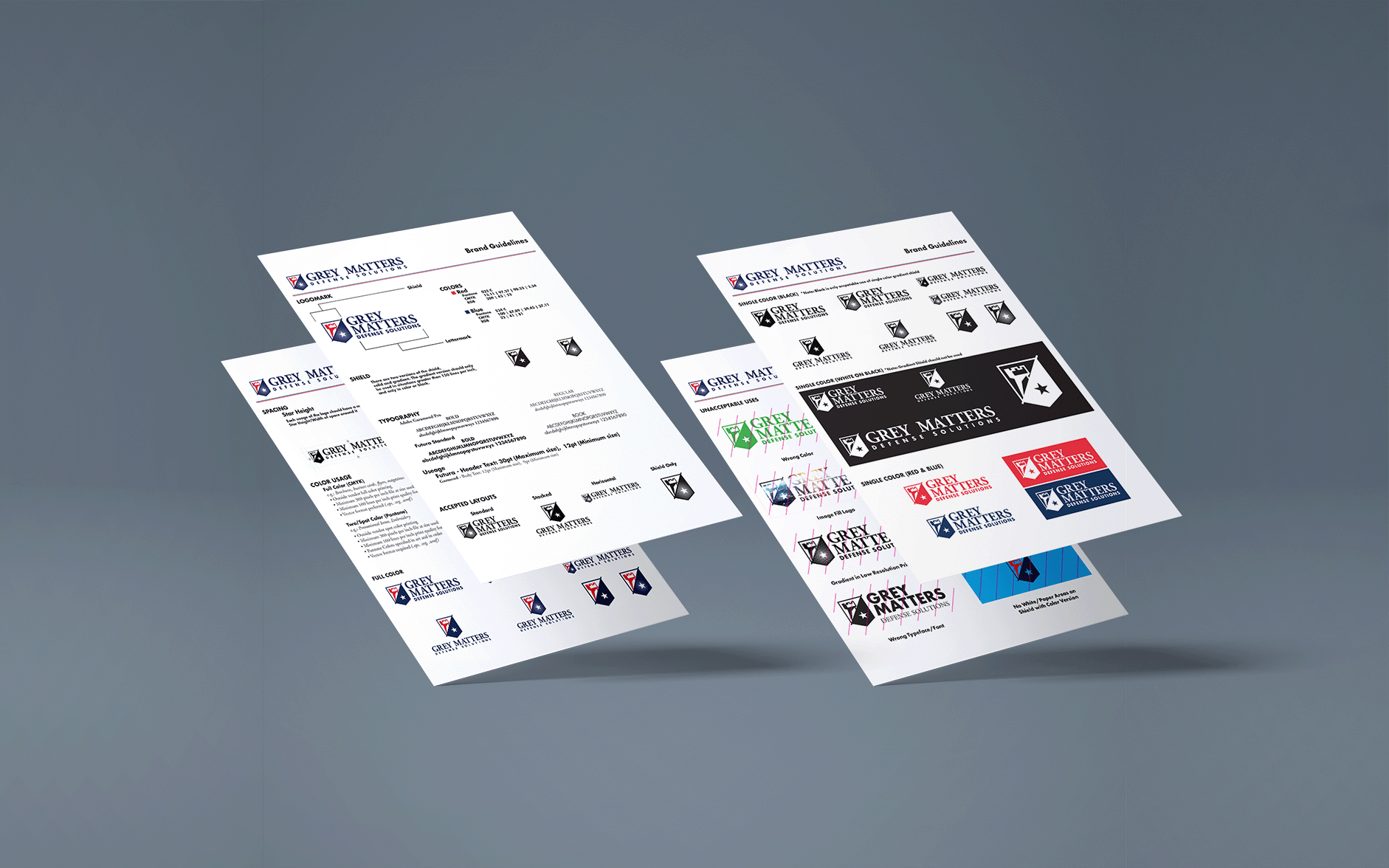 Grey Matters Defense Solutions had a logo, but no guidelines documentation. Brand guidelines ensure brand consistency, as brands can distort over time, and potentially damage the brand value and reputation. Defined and built out brand guideline documentation. Intended to be distributed as a pdf, but could be printed as a booklet style single fold 11×17 inch sheet.
