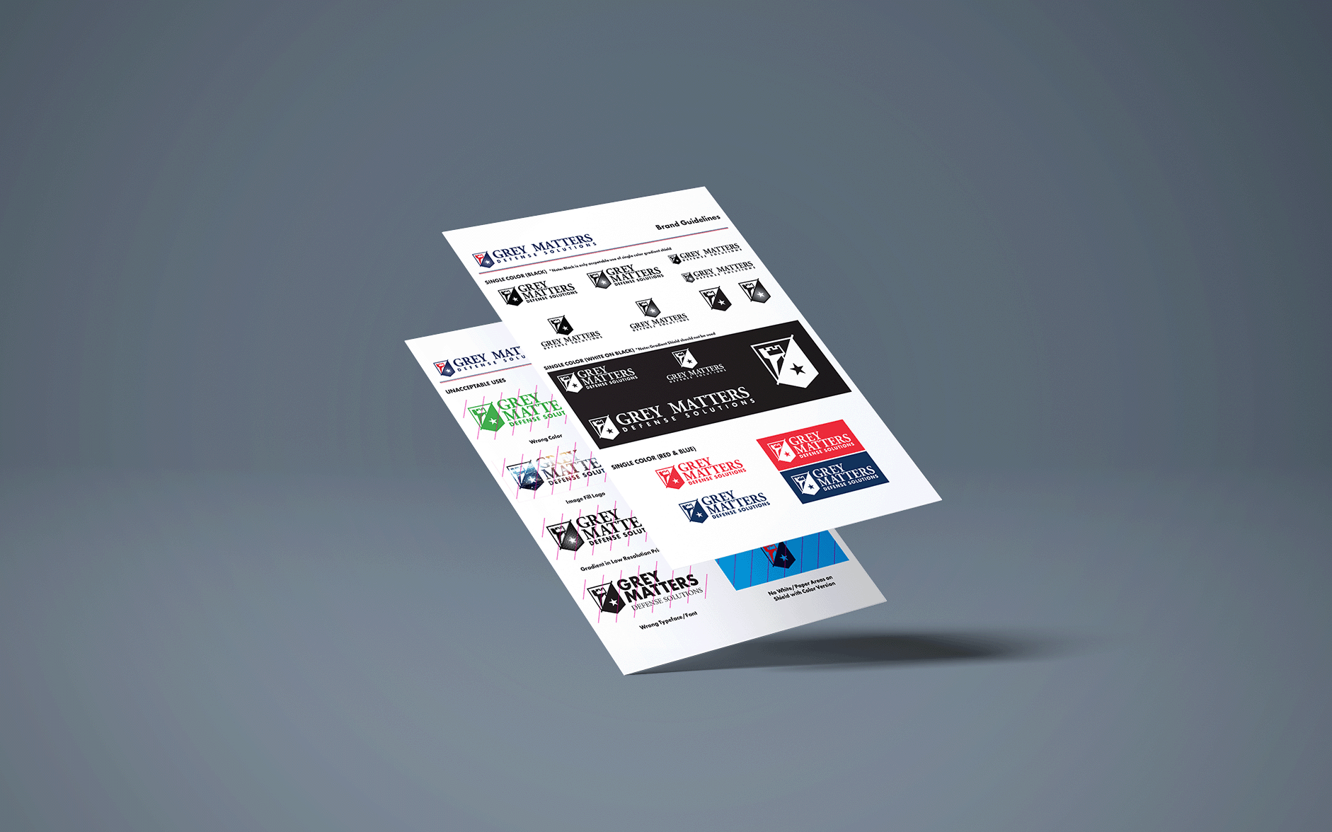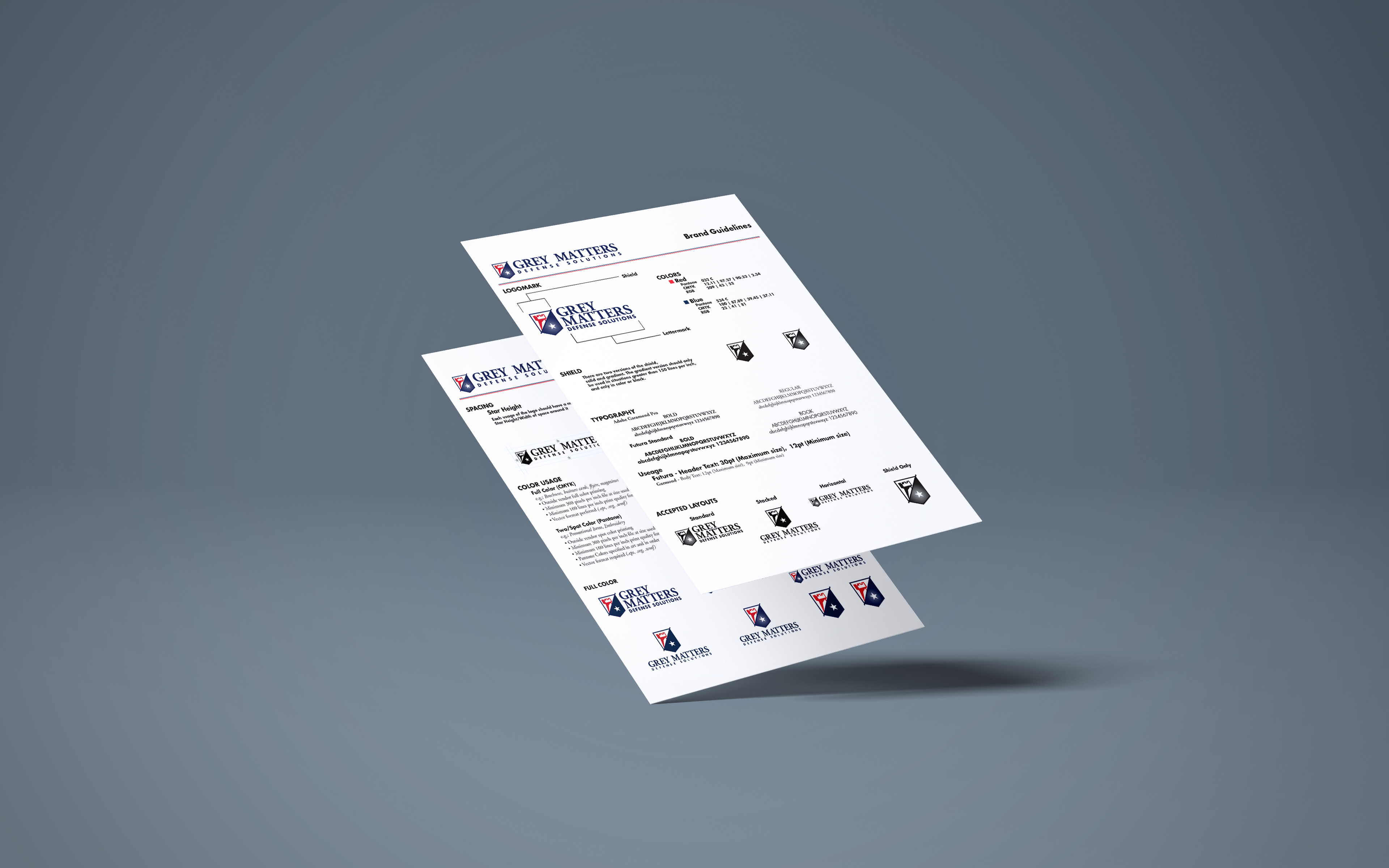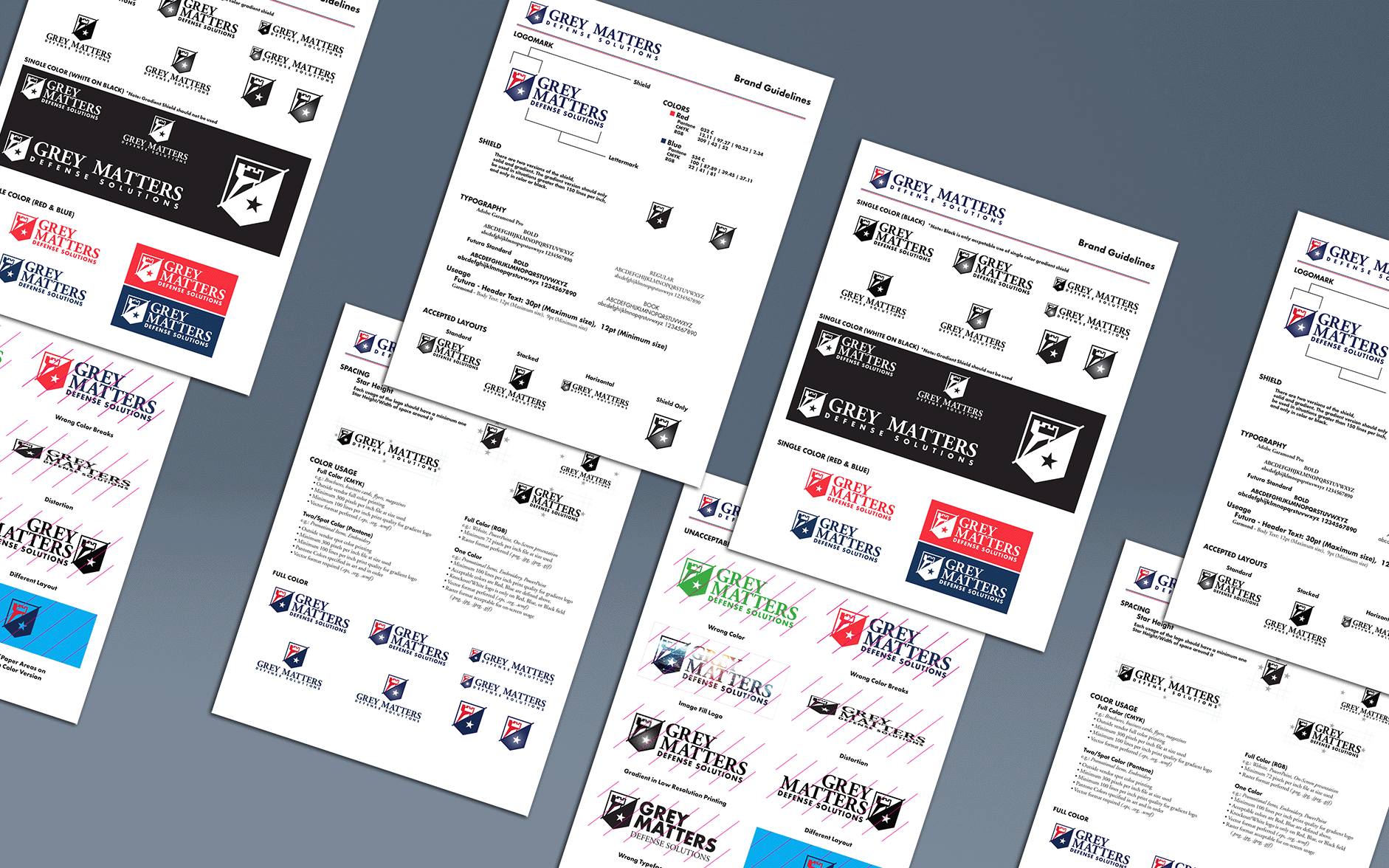 Grey Matters Defense Solutions had a logo, but no guidelines documentation. Brand guidelines ensure brand consistency, as brands can distort over time, and potentially damage the brand value and reputation. Defined and built out brand guideline documentation. Intended to be distributed as a pdf, but could be printed as a booklet style single fold 11×17 inch sheet.