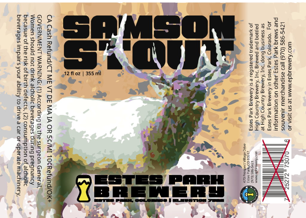 As described on epbrewery.com: Our commemorative ale honors Samson the elk, the unofficial mascot of Estes Park, who was killed by a poacher. This is a dark, rich oatmeal stout that’s surprisingly easy to drink. We use Galena And Goldings hops to balance the sweetness. Samson Stout placed 3rd in the Oatmeal Stout category in the 2004 North American Beer Awards.
