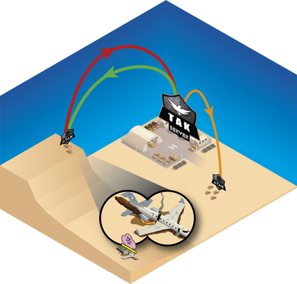 The infographic presents a scenario where an aircraft has crashed and observed by a unit. Via communication with a TAK server located at base, additional forces are dispatched for search and rescue, with precise information.