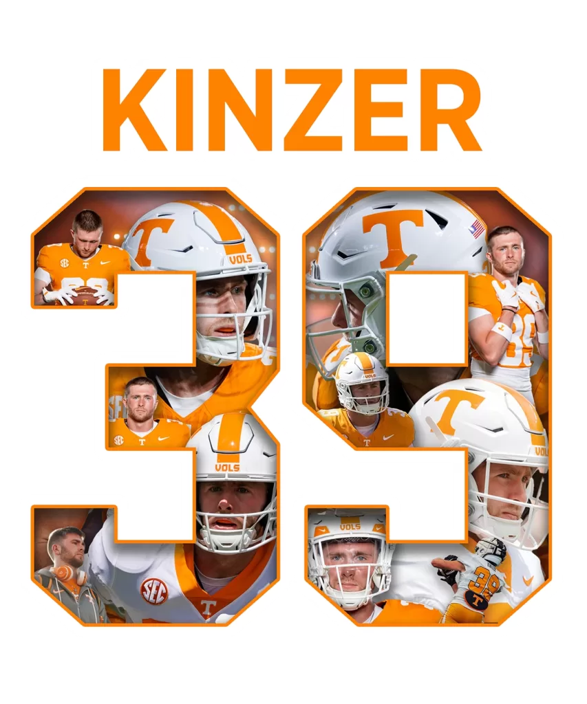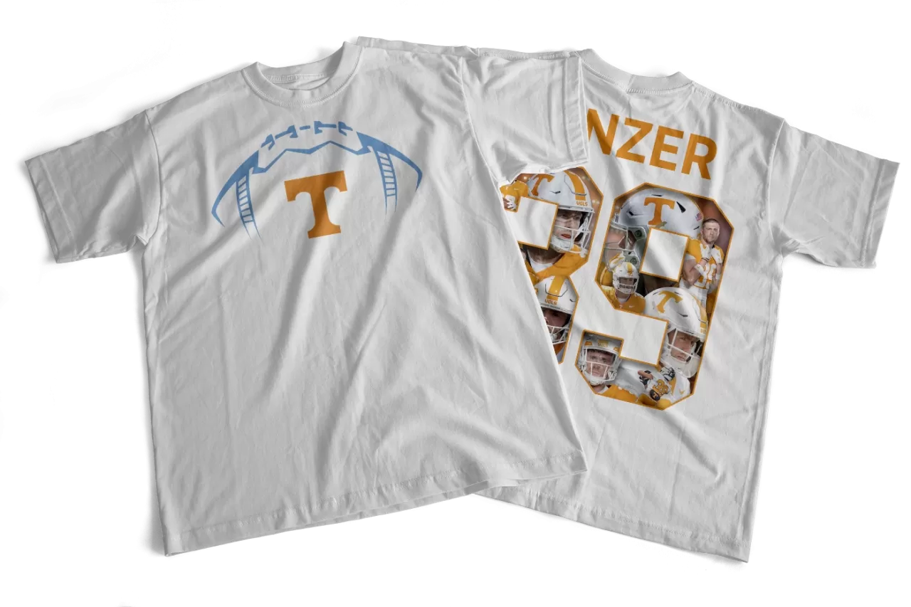I designed a stylized football illustration inspired by various designs I have admired over the years and incorporated the University of Tennessee Power T to showcase my team pride. On the back, I created a collage of images featuring my favorite player, my son Malcolm Kinzer, arranged inside the shape of his number 39 to give the shirt a personal and unique touch.